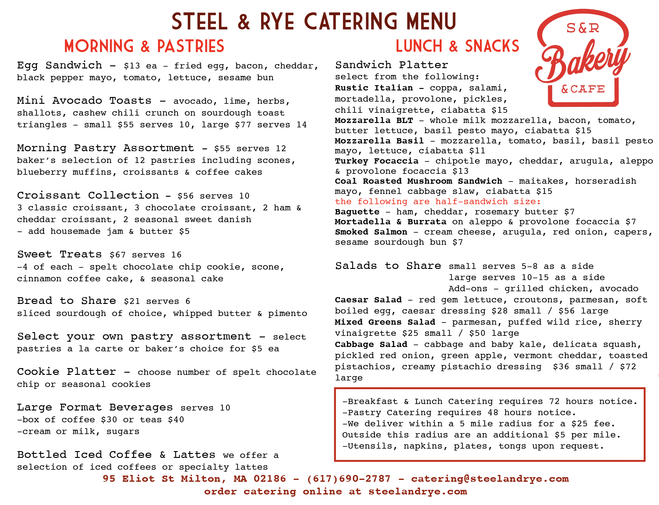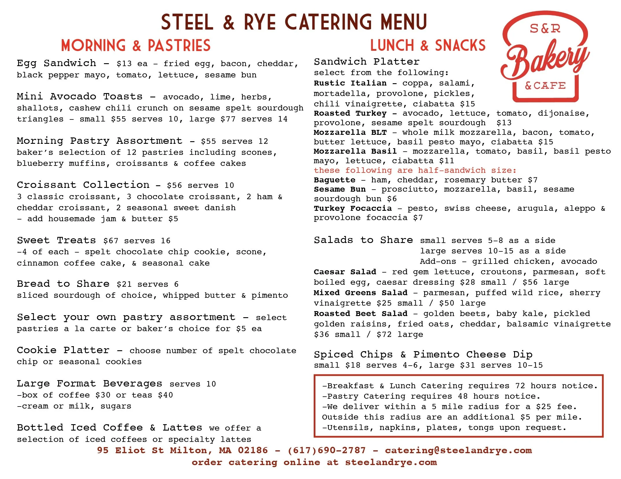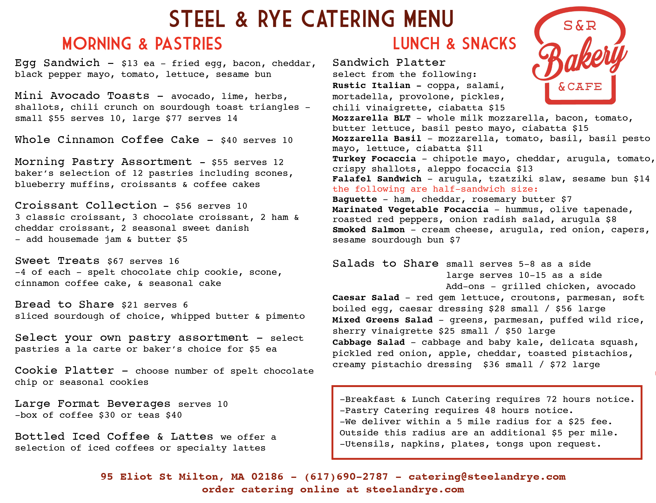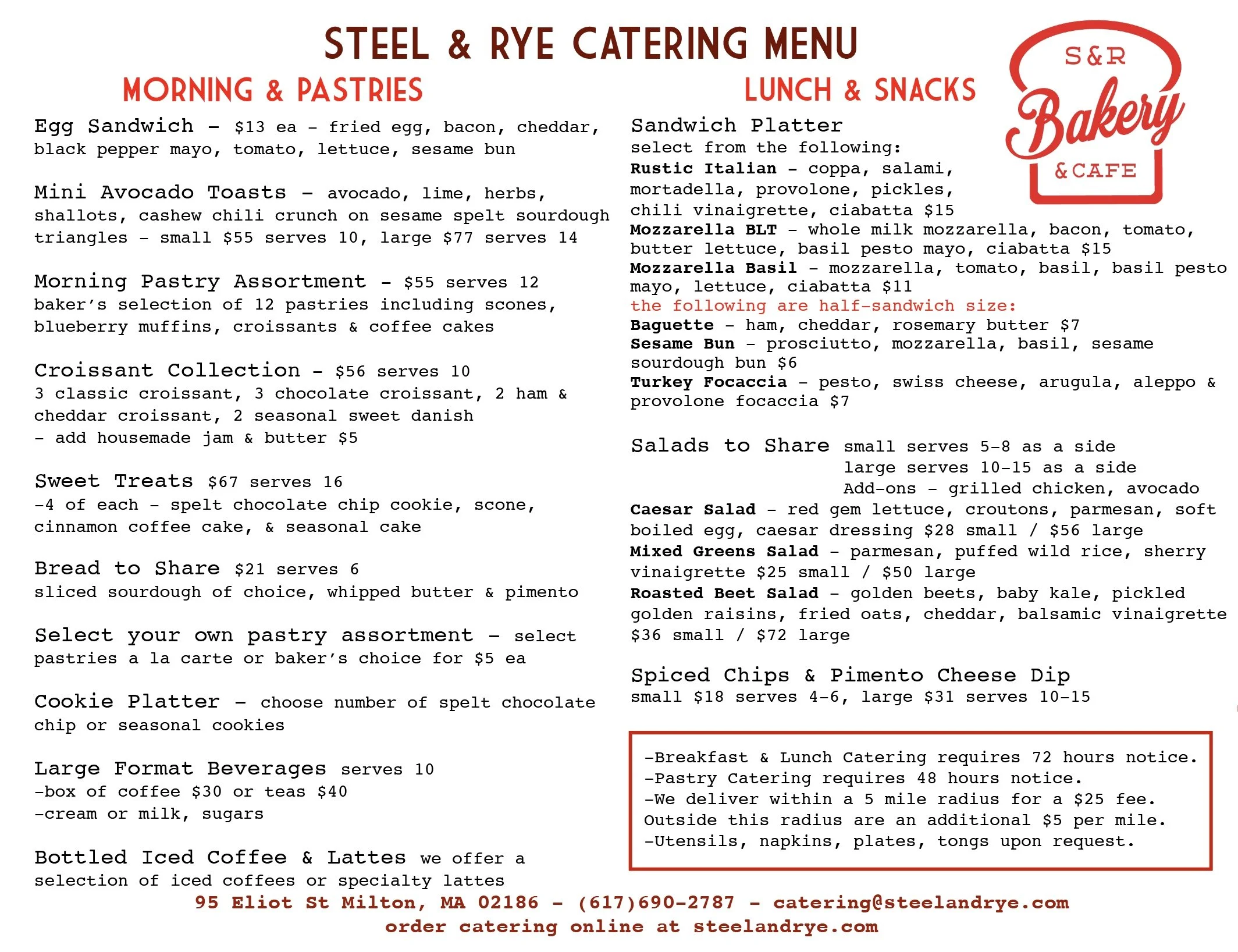 Bakery, Breakfast, and lunch catering with 48-72 hours notice.